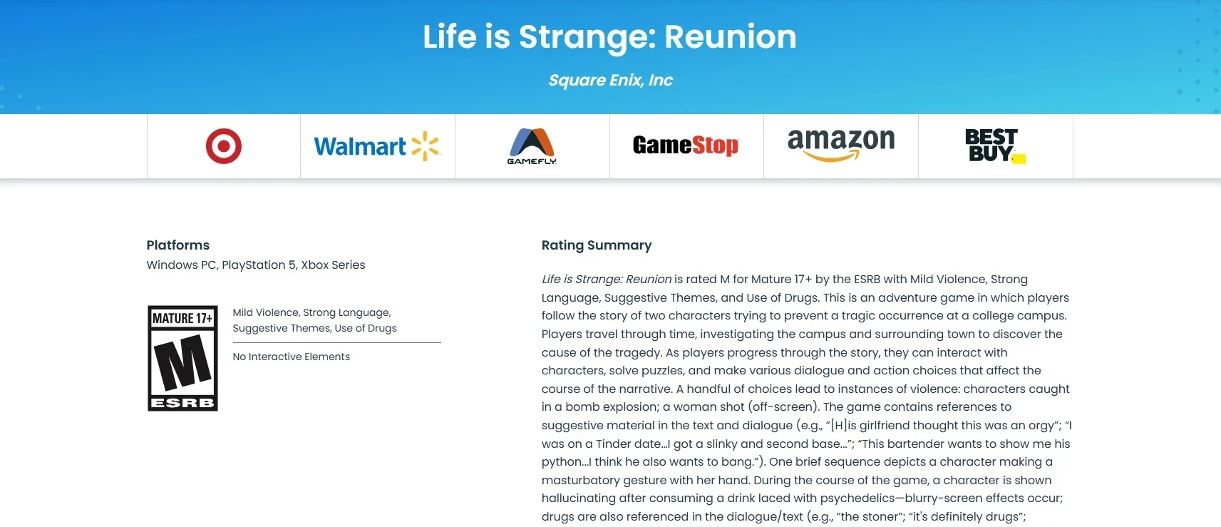 Обложка: скриншот игры Life Is Strange: ReunionАмериканское агентство ESRB выдало Life is Strange: Reunion взрослый рейтинг M/Mature. Это значит, что игру не рекомендуют лицам младше 17 лет.