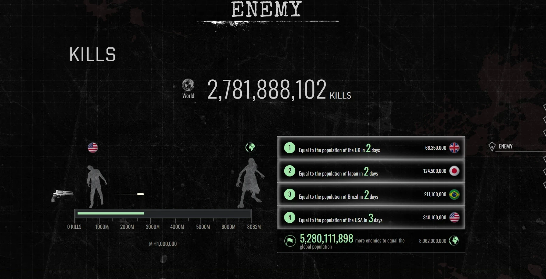 • Игроки убили уже 2 781 888 102 врагов. Всего за 2 дня количество сравнялось с населениями Великобритании, Японии и Бразилии (и России). За 3 дня — с населением США. Осталось убить ещё 5 280 111 898 врагов, чтобы сравняться с населением всего мира.