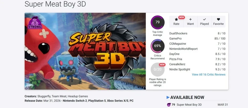Дополнительно стоит отметить, что на Metacritic версия Super Meat Boy 3D для Switch 2 заработала 73 балла (4 обзора), а на OpenCritic у всей игры 69% одобрения.