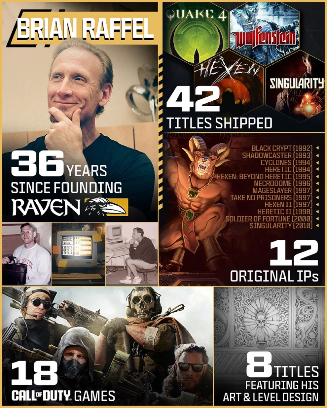 «От мрачных, потусторонних миров до галактических просторов, Брайан создавал истории, которые оставили неизгладимый след в сердцах игроков по всему миру. Его работы охватывают такие игры, как Hexen, Star Wars Jedi Knight: Jedi Academy, X-Men Legends, Wolfenstein и многие другие, каждая из которых стала частью культового наследия. Первые десятилетия достижений обеспечили Raven место среди великих и помогли заслужить доверие, чтобы формировать и развивать франшизу Call of Duty, на протяжении многих лет», — Raven Software.